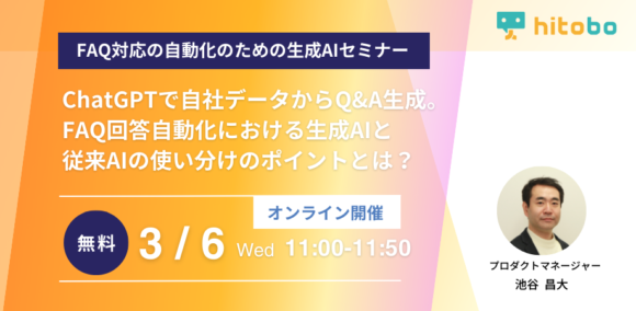 【2024年3月6日(水)】セミナー『ChatGPTで自社データからQ&A生成。FAQ回答自動化における生成AIと従来AIの使い分けのポイントとは?』 ニュース, 開催セミナーBy 渡邊いずみ2024年2月20日日時: 2024年3月6日(水)11:00~11:50(10:50からアクセス受付) 会場: オンライン(zoomを予定。後日ご案内します。) 参加費: 無料
