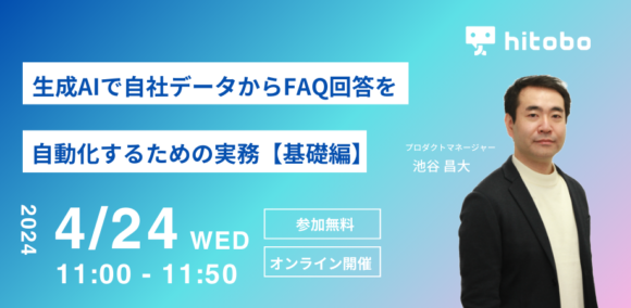 【2024年4月24日(水)】セミナー『生成AIで自社データからFAQ回答を自動化するための実務【基礎編】』 ニュース, 開催セミナーBy 渡邊いずみ2024年4月9日日時: 2024年4月24日(水)11:00~11:50(10:50からアクセス受付) 会場: オンライン(zoomを予定。後日ご案内します。) 参加費: 無料