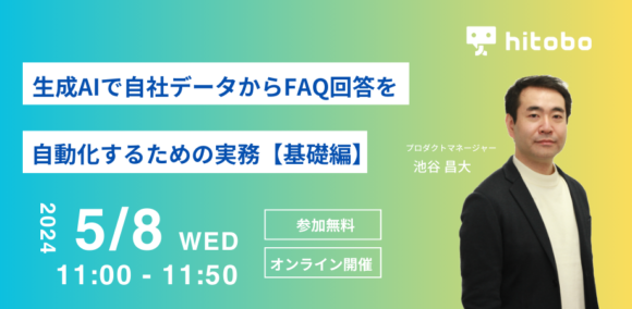 【2024年5月8日(水)】セミナー『生成AIで自社データからFAQ回答を自動化するための実務【基礎編】』 ニュース, 開催セミナーBy 渡邊いずみ2024年4月23日日時: 2024年5月8日(水)11:00~11:50(10:50からアクセス受付) 会場: オンライン(zoomを予定。後日ご案内します。) 参加費: 無料