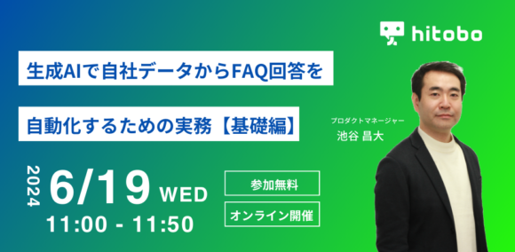 【2024年6月19日(水)】セミナー『生成AIで自社データからFAQ回答を自動化するための実務【基礎編】』 ニュース, 開催セミナーBy 渡邊いずみ2024年6月4日日時: 2024年6月19日(水)11:00~11:50(10:50からアクセス受付) 会場: オンライン(zoomを予定。後日ご案内します。) 参加費: 無料