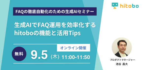 【2024年9月5日(木)】セミナー『生成AIでFAQ運用を効率化するhitoboの新機能と活用事例』 ニュース, 開催セミナーBy G5nk7vzu2024年8月13日日時: 2024年8月7日(水)11:00~12:00(10:50からアクセス受付) 会場: オンライン(zoomを予定。後日ご案内します。) 参加費: 無料
